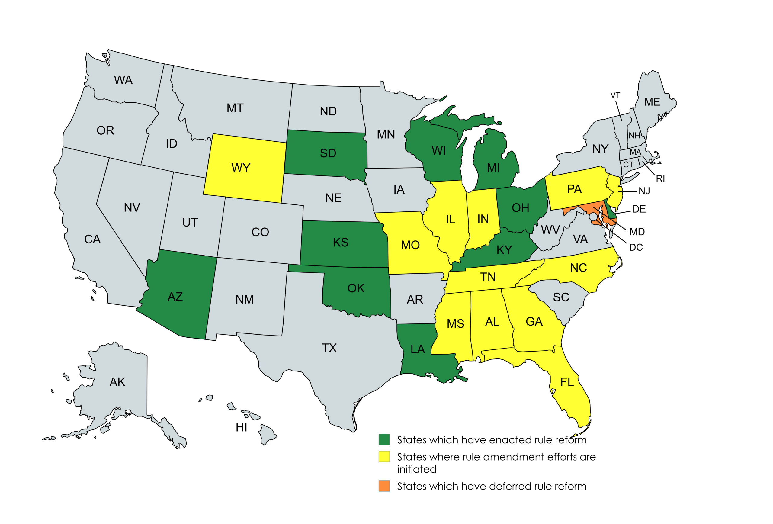 Initiatives to implement amended expert evidence admission standards in FRE 702 are accelerating, and efforts to secure aligned state rules are expanding in 2025. Working groups in over a dozen states are advocating for state expert evidence rule amendments, including new groups in Indiana and Tennessee. These initiatives will build on the adoption of amended rules in six jurisdictions in 2024.
